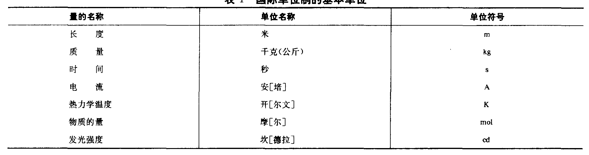 19—5 中华人民共和国法定计量单位 1984年2月27日,国务院发布了《关于在我国实行法定计量单位的命令》,指出:一、我国的计量单位一律采用《中华人民共和国法定计量单位》。二、目前使用的市制计量单位,可以延续使用到1990年,1990年底以前要完成向法定计量单位的过渡(农田土地面积计量单位的改革除外)。 我国的法定计量单位(以下简称法定单位)包括: <1>;国际单位制的基本单位(见表1); <2>;国际单位制的辅助单位(见表2); <3>;国际单位制中具有专门名称的导出单位(见表3); <4>;国家选定的非国际单位制单位(见表4); <5>;由以上单位构成的组合形式的单位; <6>;由词头(见表5)和以上单位所构成的十进倍数和分数单位。表1 国际单位制的基本单位