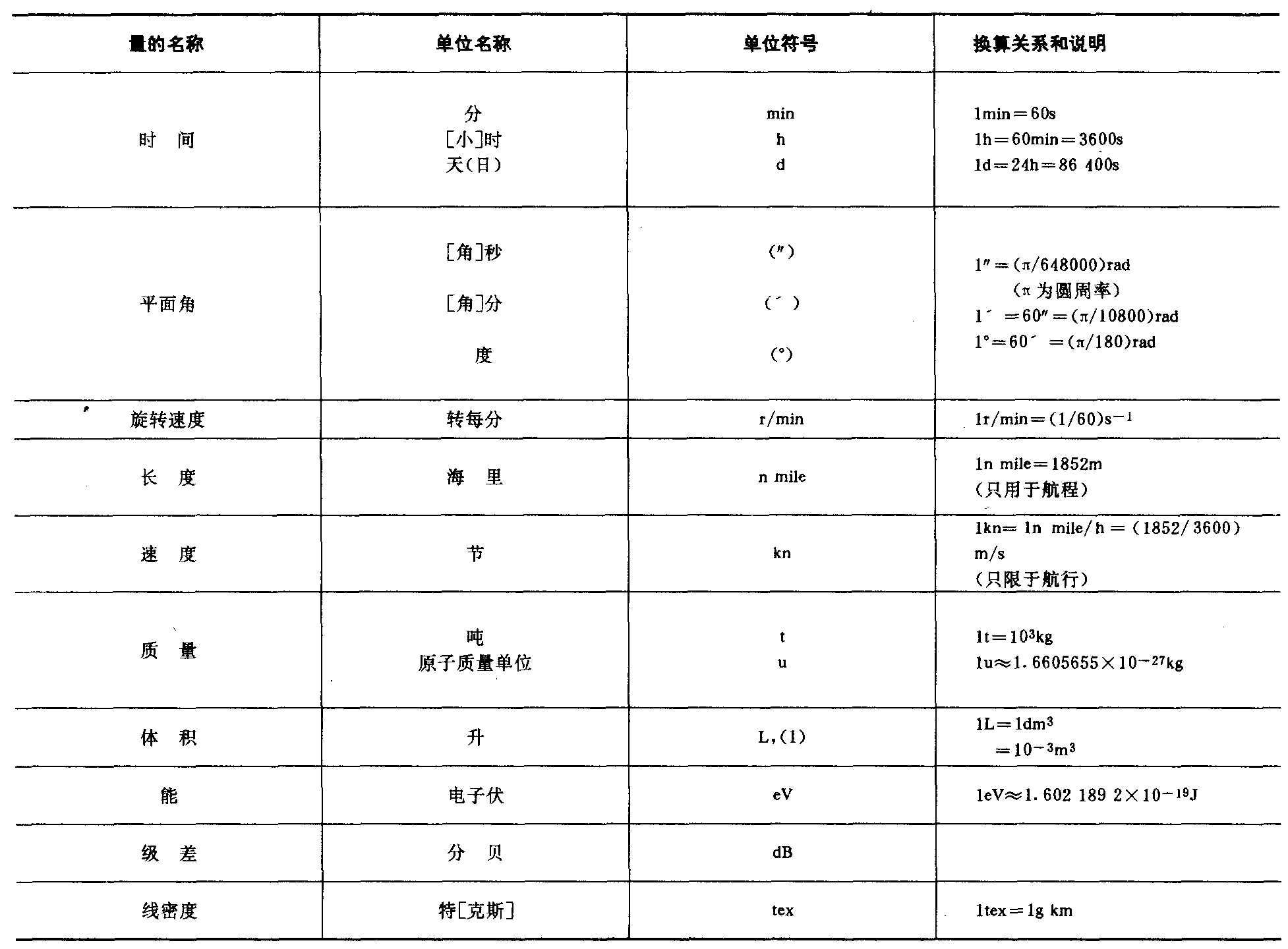 注:1.周、月、年(年的符号为a),为一般常用时间单位。2.[ ]内的字,是在不致混淆的情况下,可以省略的字。3.( )内的字为前者的同义语。4.角度单位度、分、秒的符号不处于数字后时,用152括弧。5.升的符号中,小写字母1为备用符号。6.r为“转”的符号。7.人民生活和贸易中,质量习惯称为重量。8.公里为千米的俗称,符号为km。9.104称为万,108称为亿,1012称为万亿,这类数词的使用不受词头名称的影响,但不应与词头混淆。 |