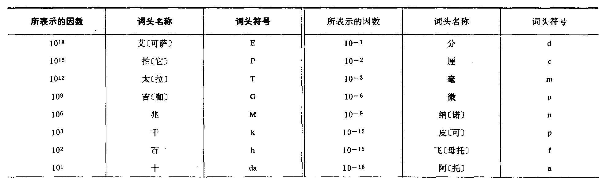 表5 用于构成十进倍数和分数单位的词头
