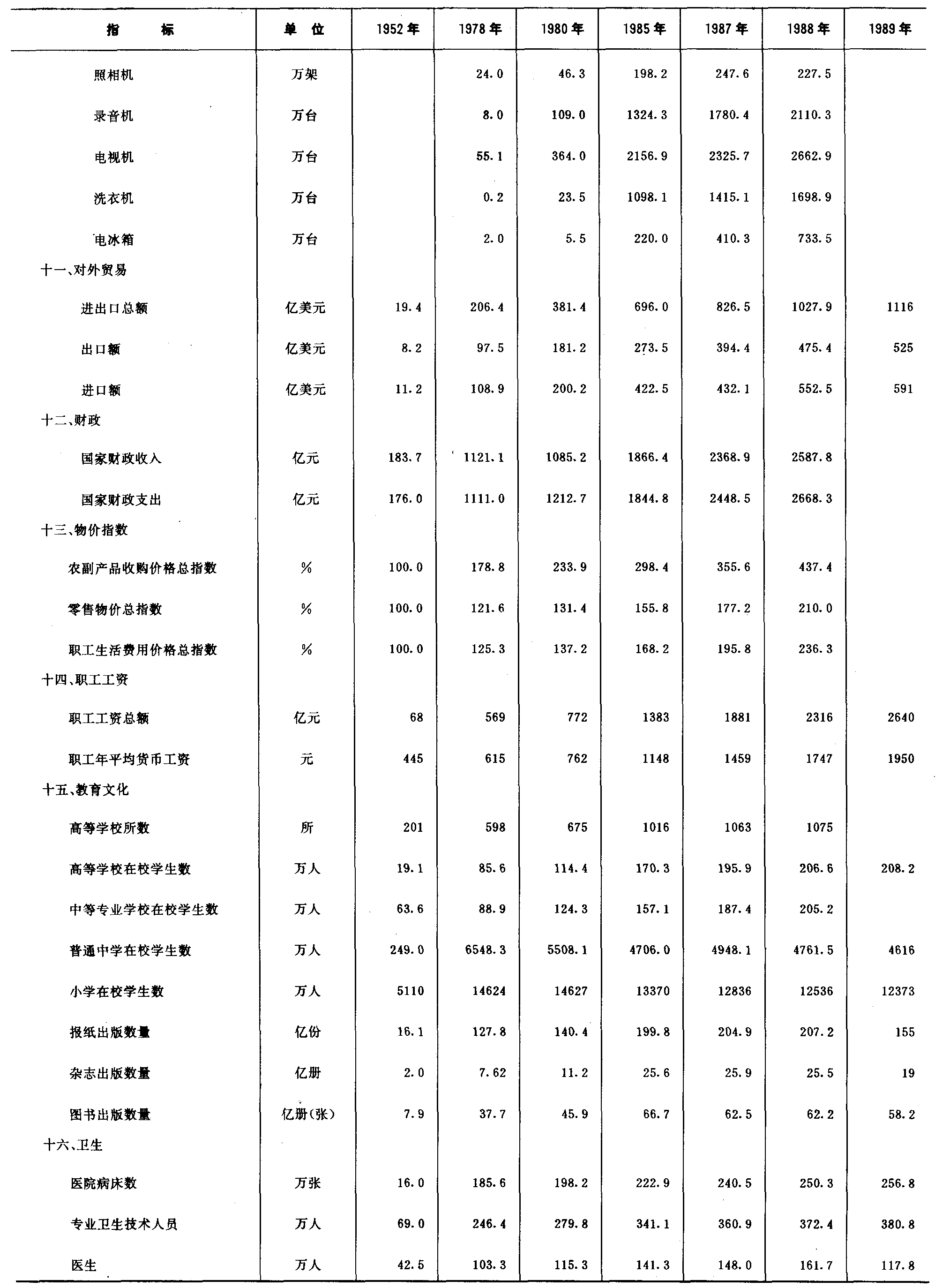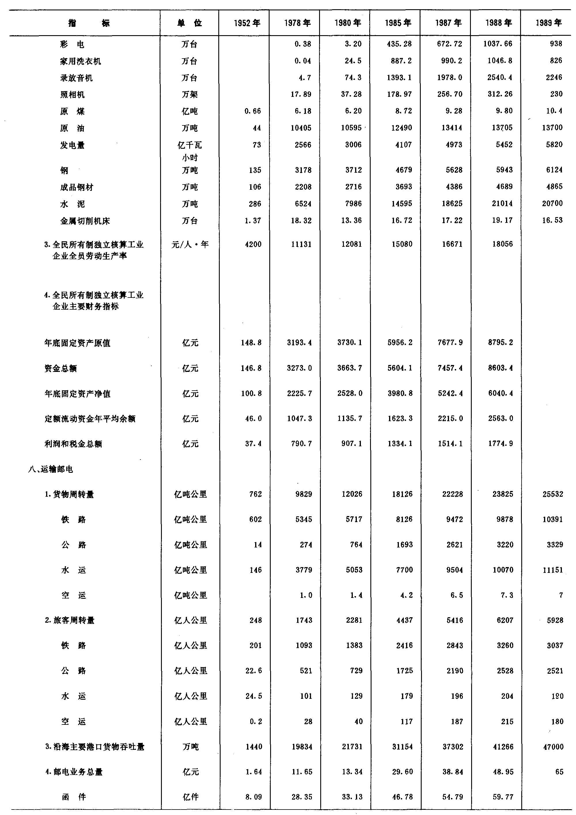 注:1.全民所有制独立核算工业企业全员劳动生产率,按1980年不变价格计算;2.1980年以后货物周转量包括公路运输中社会车辆完成数,1985年及以后还包括私营运输完成的数量;3.1987、1988年沿海主要港口货物吞吐量如包括龙口、威海等10个中型港口数字应为39625和43814;4.邮电业务总量,1981年以前按1970年不变价格计算,以后按1980年不变价格计算。5.1952、1978年对外贸易数字为经贸部统计数,1980年以后为海关统计数。6.1988年财政收支为初步数。 |