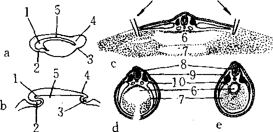 蛙胚与鸡胚的胚体与卵黄关系图 a. 蛙胚纵切面 b. 鸡胚纵切面 c、d.鸡胚横切面 e.蛙胚横切面 1.前肠 2. 口窝 3. 肛窝 4. 后肠 5. 中肠 6.原肠腔 7. 卵黄 8. 神经管 9. 体节 10.体腔 |