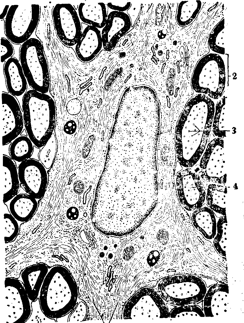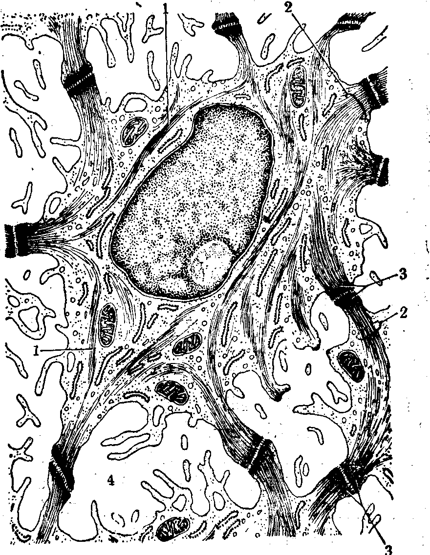 图1 张力丝(人表皮棘细胞) 1.张力丝 2.聚成张力原纤维 3.桥粒 4.细胞间隙