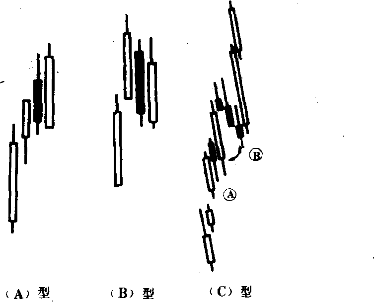 ❸C型、B点若是长阴线,则表示股价可能暴跌,A至B点表示卖方的休整阶段,其后股价随即上升,投资者应按第三根阴线(即B点)的终盘价买进。