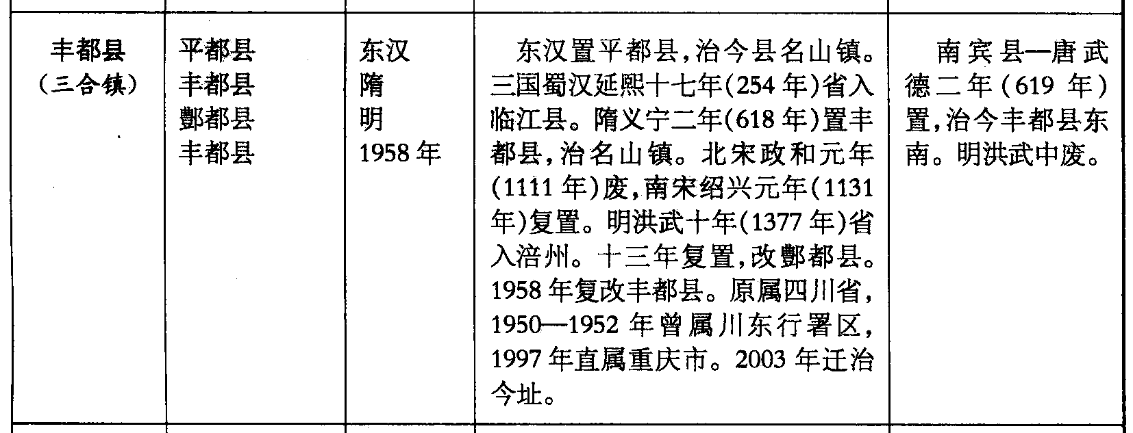 丰都县(三合镇)平都县丰都县鄷都县丰都县东汉隋明1958年东汉置平都县,治今县名山镇。三国蜀汉延熙十七年(254年)省入临江县。隋义宁二年(618年)置丰都县,治名山镇。北宋政和元年(1111年)废,南宋绍兴元年(1131年)复置。明洪武十年(1377年)省入涪州。十三年复置,改鄷都县。1958年复改丰都县。原属四川省,1950—1952年曾属川东行署区,1997年直属重庆市。2003年迁治今址。南宾县—唐武德二年(619年)置,治今丰都县东南。明洪武中废。