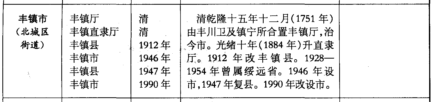 丰镇市(北城区街道)丰镇厅丰镇直隶厅丰镇县丰镇市丰镇县丰镇市清清1912年1946年1947年1990年清乾隆十五年十二月(1751年)由丰川卫及镇宁所合置丰镇厅,治今市。光绪十年(1884年)升直隶厅。1912年改丰镇县。1928—1954年曾属绥远省。1946年设市,1947年复县。1990年改设市。