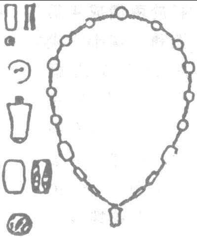| 释义 | 古代名物 > 香奩類 > 首飾部 > 頸飾 > 串飾 串飾 chuàn shì 頸飾的一種。將帶孔各種飾物,穿之以繩,懸掛於頸,或佩于腰間,以作裝飾。原始串飾用料大都爲骨、陶、貝殼、蚌殼、新石器時代有石珠、骨珠、石管、獸牙等,以後發展爲金、玉、珍珠、寳石。1963年,湖南寧鄉發現一商代提梁卣,卣内裝滿玉珠、玉管計一一七二顆,其中間均有孔。鄭州上街商代遺址,出土陶珠一六七顆,扁圓形,均穿孔,直徑不足一厘米,顏色呈灰、棕,出土時大部分整齊排列,原當串連於一體。河北懷來北辛堡兩座燕國墓葬,分别出土石串飾二六四枚、一九七五枚,均有穿孔,出於墓主人之頸部。雲南江川李家山,出土不同色彩之瑪瑙、軟玉、緑松石、珠飾,多以萬計。