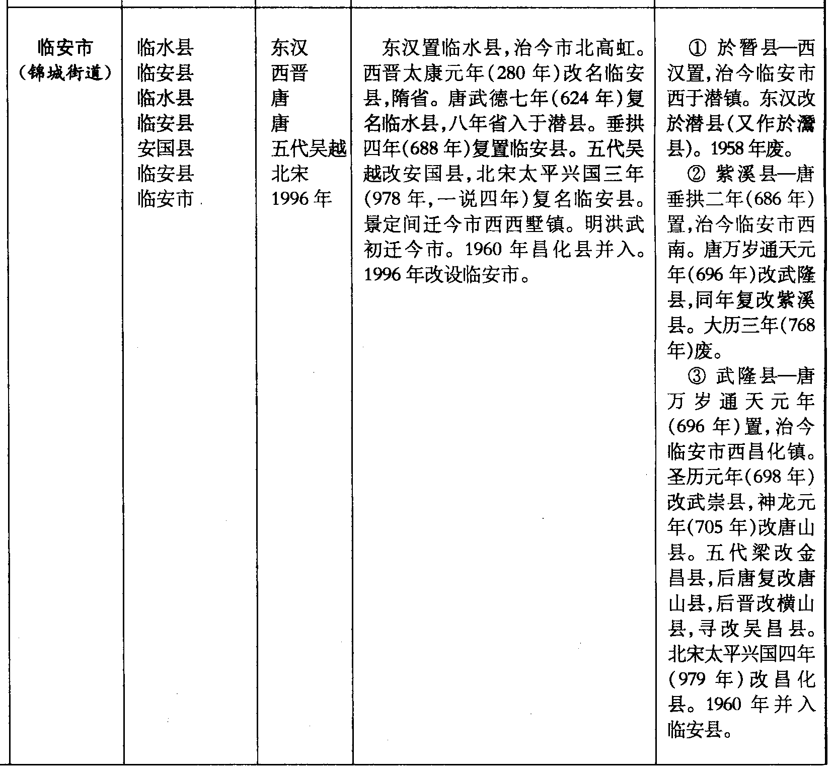 东汉置临水县,治今市北高虹。西晋太康元年(280年)改名临安县,隋省。唐武德七年(624年)复名临水县,八年省入于潜县。垂拱四年(688年)复置临安县。五代吴越改安国县,北宋太平兴国三年(978年,一说四年)复名临安县。景定间迁今市西西墅镇。明洪武初迁今市。1960年昌化县并入。1996年改设临安市。