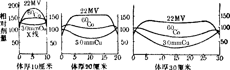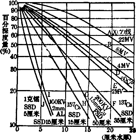 (2) 中心轴百分深度剂量: 皮肤表面的吸收剂量称为皮肤剂量。一般,低半价层射线及大野照射时的皮肤剂量高,皮肤放射反应重;高半价层射线及小野照射,皮肤剂量低,皮肤放射反应轻。体模中照射野线束中心轴上某一深度处吸收剂量(Dd)与某一固定参考点的吸收剂量(D0)之比称为中心轴百分深度剂量: Dd%= %;D0一般选最大电离深度处的吸收剂量,如低能X线最大电离深度选在皮肤表面; 60钴则选在0.5cm处; 高能X线则随能量增高而加深。射线在体模内的中心轴百分深度剂量受三个因素的影响: 射线能量越高,由于穿透力强,深度剂量大;大照射野,由于散射线增多,深度剂量较高;增长照射距离,由于组织深度和照射距离相比相对较小,射线强度变化减缓,亦能提高深度剂量(图1)。源皮距(skin source dist-ance,SSD)短的治疗机,如137铯近距离治疗机(SSD15cm),由于平方反比定律的作用,百分深度剂量随着深度而迅速减小。相反,60钴治疗机的SSD一般为75~100cm,这种作用相对变小,其深度剂量就大得多。对深部治疗X线机的射线,起主要作用的是介质内的吸收,因此百分深度剂量比60钴小。高能X线,如4MV治疗机,与60钴的γ线相似,且一般采用100cm的焦皮距(focus skin distance,FSD),百分深度剂量也相似。在同样FSD条件下,X线的能量愈高,百分深度剂量愈大。10MV X线的深度剂量比60钴γ线的深度剂量高,而22MVX线百分深度剂量分布最好。但能量高的加速器,价格高,结构复杂。