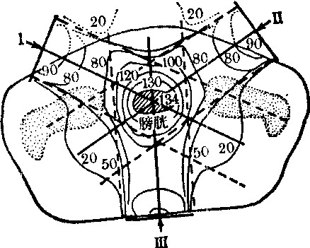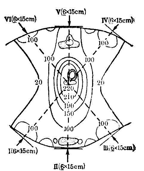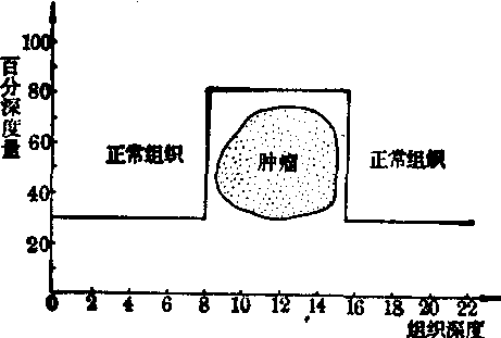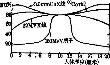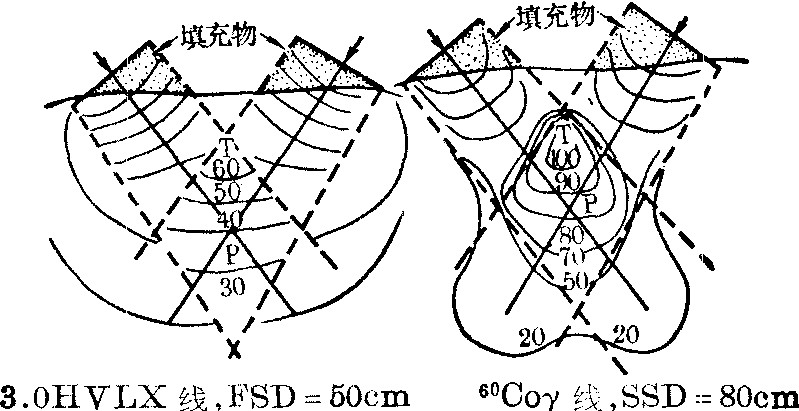 图1 中心百分深度剂量随能量变化 SSD——放射源(S)至皮肤(S)的距离 FSD——焦点(F)至皮肤(S)的距离 (3)等剂量曲线: 在照射野内,由于上述三个因素,同一深度处的中心轴外的剂量都比中心轴上的剂量为小,因而在同一深度,离中心轴越远,剂量越小。如将深度剂量相同的点连接起来,会出现两端向上弯曲的曲线;各个深度的类似曲线可组成一个照射野的等剂量曲线。 临床剂量学原则 深部肿瘤的治疗,剂量学上要求: ❶剂量准确; ❷治疗区域内剂量分布均匀; ❸尽力提高肿瘤剂量,降低正常组织受量; ❹保护重要器官(如脊髓等)免受或少受照射。图2示理想剂量学曲线。临床除选择射线能量外,可用射野结合(对野或多野)的办法获得近似曲线(图3)。高能电子束在介质中具有一定的射程,从表面到一定深度剂量分布均匀,符合剂量曲线的要求。高LET(除去快中子)射线的剂量分布具有理想剂量学曲线特点(见高线性能量传递图)。 ![]() 图2 理想剂量学曲线 ![]() 图3 四种不同射线(对野照射)的剂量曲线 照射野的临床应用 根据射线的性质,按照剂量学原则,设计治疗计划。单野照射时,肿瘤剂量一般不足,须多野结合,以得到肿瘤区域内适当的剂量分布。 (1) 两野或三野结合: 两野最简单的结合是相对野。图4表示三种典型的低、高和很高能量X射线对野照射中心轴上的剂量分布随射野间距的变化关系。22MV高能X线,由于剂量建成效应,皮肤剂量较小,在4cm处升至高剂量后趋于恒定;60钴γ线的剂量在皮下升得较快,约5mm深度达到最高值,此后剂量开始下降,两野之中剂量最低,随着射野间距增大,最低值区愈来愈宽;200kVpX线,由于没有建成区,最高剂量为皮肤表面,两野中心剂量比60钴的更低。因之,200kVp X线和60钴γ线用对野照射并无多大优点; 高能射线只在体厚较小时,两野中心处剂量与皮肤剂量之比较大,剂量分布均匀。图5为两野交角(60度)照射时的等剂量分布,与单野近似,称为“内野”照射;由于肿瘤区域内剂量不均匀,随深度增加不断减低,目前很少使用。为了改善这种不均匀性,从病人对侧向P点另设第三野(图6),肿瘤区域可有均匀的剂量分布。三野照射法,在放疗中用途很广。 ![]() 图4 6×8厘米2射野对野照射时中心轴上的剂量分布 ![]() 图5 两个6×6厘米射野互成60°角对准皮下8厘米P点照射时的剂量分布 (2) 多野结合: 有时需要用四野到六野相结合,以获得更高的均匀的肿瘤剂量,并使正常组织得到保护。图7为六野(6×15cm)60钴射线结合治疗食管癌的等剂量分布,与三野照射比较,无多大优越性。采用高能X线后,六野照射法已很少使用。 (3) 旋转治疗: 系以野的旋转代替多野固定照射。旋转治疗时病人固定,放射源围绕病人旋转。旋转中心取在肿瘤中心,放射源至肿瘤中心的距离(F)固定,而放射源到病人皮肤表面的距离(f)随角度不同而变化,因此一般的中心百分深度量表很难使用,需要利用肿瘤空气比(tumour-air ratio,TAR)进行计算。肿瘤空气比为在空间同一点,相同照射野的肿瘤剂量Dt和空气剂量Dta之比,即: ![]() 图6 三个6×8厘米60钴射野互成120°角对准膀胱照射的等剂量分布(SSD75厘米)