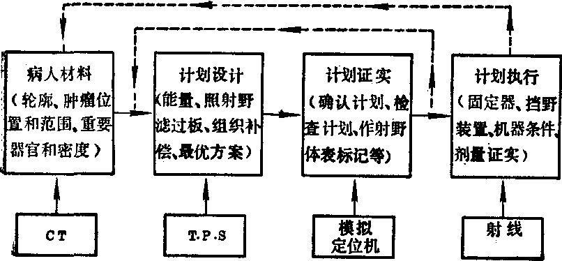 图7 六野(6×15厘米,SSD75厘米)60钴射线结合治疗食管癌剂量分布 肿瘤空气比可以直接测量,也可以由中心轴百分比深度剂量求得,二者关系为: 式中B为反向散射因素,D为深度d处的百分深度剂量。肿瘤空气比是比较两种不同散射条件在空间同一点的剂量之比,与源皮距离无关。因此,肿瘤空气比可理解为是无限源皮距离的深度剂量。特殊照射野 包括楔形、不规则大面积、斗篷、倒丫、全身、相邻野、条形野等照射方法,这些照射野的剂量计算比较复杂。这些照射野的单独或联合使用,可以得到特殊形状的剂量分布,以适应临床上不同肿瘤的治疗情况。 不均匀组织的剂量校正 计算剂量分布时假定组织是均匀的。实际上由于骨、肺及组织空腔的存在,需要进行不均匀的人体组织对剂量分布的影响的校正。骨、肺及组织空腔内的校正主要决定于放射线的能量以及不均匀组织的范围、形状和组织密度。低能X线,由于光电吸收占主要地位,骨吸收比软组织大得多,因此用低能X线治疗时要仔细考虑和尽力避免骨损伤问题,对1MeV以上的高能X线,由于康普顿吸收占主要形式,骨吸收和软组织相同,只需要考虑肺及空腔的校正。校正工作比较复杂,需要借助电算体层扫描和电子计算机,并要进行实际测量,才能得到比较正确的结果。 密封放射源剂量学 内照射放射源剂量学问题,实际上是两个问题,即: ❶如何正确布置放射源以得到均匀照射; ❷布置好的放射源需要放置多少时间才能达到所要求的剂量。因此,内照射剂量学包括布置和计算两部分。剂量计算分三个步骤: ❶利用放射性同位素的γ电离常数,结合距离平方反比定律,计算点源在空间诸点的剂量分布; ❷线源可认为是点源的数学结合; ❸面源或体积源可认为是线源的几何结合。计算镭疗剂量有两个体系,即Quimby系统和Paterson-Parker系统。利用这些系统所列成的表,可以计算一定镭疗总量(以毫克小时为单位)的曝射量(R)或吸收量(rad),反之亦然。亦可计算垂直于线源中心的平面和垂直于线源末端的平面内任意一点剂量。这些表原先是为镭源计算的,对其他放射源,可通过对镭的当量转换系数,化成毫克镭当量以后再用。 用作内照射的密封放射源有三种形式: ❶线源: 放射源排例成连续或不连续的线; ❷面源: 由一系列的线源(针形)组成,位于一个平面内。这种面源可放在皮肤表面上进行一侧放射治疗,也可以插入肿瘤组织内进行治疗; ❸体积源: 由一系列的线源组成空间立体分布。线、面、体积源的单独或结合布置,应使肿瘤组织得到高的均匀剂量。Parterson-Parker提出了获得均匀剂量分布的线源布置规则。近年来更多利用电子计算机计算内照射的剂量分布,同时还应该用剂量仪对源的位置和剂量进行实际校对和测量。 治疗计划的设计与执行 放疗病人从就诊、治疗到结束要经过四个环节(图8):❶体模阶段: 主要是确定肿瘤的位置与范围以及与周围组织、重要器官间的相互关系。可以用脱体模法、正侧位X光片等得到病人受照部位的外轮廓和肿瘤位置、范围。新的技术是用CT直接得到受照射部位的横截面图。 ❷治疗计划设计阶段: 放疗医师根据病人的肿瘤情况,初步预计出肿瘤中心剂量、组织(主要是重要器官)最大剂量、皮肤剂量等;与物理人员一起,借助电子计算机治疗计划系统(T.P.S.)进行计划设计,包括射线能量选择,照射野大小、楔形滤过板、组织不均匀校正及补尝等,并依据临床剂量学原则,作出较优的治疗方案。 ❸治疗计划证实和修改阶段: 对第二阶段设计的治疗方案,利用模拟定位机进行校正,看是否照射准确又避开了重要的器官 (如食管癌治疗时避开脊髓)。模拟定位机的物理条件与被使用的治疗机相同,通过模拟定位机可以证实由电子计算机设计的治疗方案能否在治疗机上正确执行;如果计划较好但实际不能执行,仍然需要重新设计。 ❹治疗计划执行阶段: 存在多种因素影响放疗计划的正确执行。正确摆位是执行计划的关键,要求每次摆的位置重复性好。为此常需要制作各种部位的治疗固定器和挡野装置。有条件的单位,应在治疗中进行一些体内剂量测量,以证实治疗区域内剂量是否正确。目前较好的测量方法是用热释光剂量计进行体内测量。上述四个阶段是相互依存的。病人的每次治疗均涉及到医生、技术员、物理工作者的密切合作,只有这样才能有效地提高医疗质量。 ![]() 图8 现代放疗计划执行过程 ☚ 射线剂量学 放射防护 ☛ |