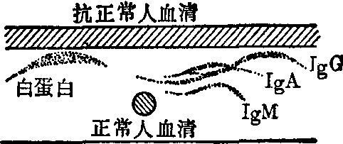 图2 双向琼脂扩散试验示意图 (6) 免疫电泳(图4):是将琼脂电泳和双向琼脂扩散两法结合起来,用于分析抗原组成的一种定性试验。先将待检抗原在琼脂板小孔中进行电泳,再在琼脂板中央挖一横槽,加入已知相应免疫血清。经一定时间相互扩散后,在最适比例部位形成沉淀弧。根据沉淀弧的数量、位置和外形,即可分析样品中所含的成分及其性质。本试验主要用于血清蛋白组成分析,测定抗原或抗体的纯度等。