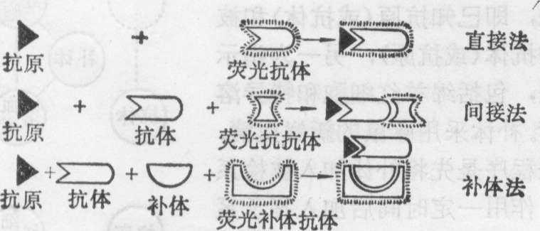 图5 补体结合反应图解 上、中: 补体结合反应阴性(溶血) 抗链球菌溶血素O试验 是中和试验中的一种。乙型溶血性链球菌产生的溶血素O,能溶解人或兔的红细胞。且因抗原性强,患者有相应抗体形成。试验方法是先将病人血清作一系列稀释,再加入链球菌溶血素O。37℃经一定时间后,加入兔红细胞。若血清中含有相应抗体,则溶血素O毒性被中和,不出现溶血现象。当该抗体滴度增高到400单位以上时,表明患者在不久前或目前有溶血性链球菌感染,结合临床症状,有助于风湿病的诊断。免疫荧光法(图6) 或称荧光抗体法,是一种抗原抗体特异性与形态学相结合的方法。原理是某些荧光素,在一定条件下可与抗体分子结合,但不影响抗体与抗原特异性结合的性能。用这种荧光抗体着染标本,置于荧光显微镜下观察,可对标本中相应抗原进行鉴定和定位。常用荧光素有异硫氰酸荧光素 (FITC)、罗丹明(RB200)等。基本方法有直接法、间接法和补体法三种。直接法是将荧光抗体直接滴加于玻片的标本上,半小时后冲洗去多余荧光抗体,若有相应抗原,则在镜下可见发荧光的抗原抗体复合物。本法简便,缺点是每检查一种抗原,事先须制备与其相应的荧光抗体。间接法是先使未标记特异性抗体与相应抗原结合,然后再滴加荧光标记的抗免疫球蛋白抗体(或称抗抗体),阳性时,镜下可见抗原-抗体-抗抗体复合物。本法优点是制备一种荧光抗抗体后,可用于多种抗原、抗体系统的检查,且敏感度较直接法为高。补体法的原理与间接法相似。不同处是用免疫血清处理标本后,加上富含补体的新鲜豚鼠血清,使标本中的抗原形成抗原-抗体-补体复合物。然后用抗豚鼠补体C3的荧光抗体染色,使上述复合物发出荧光。荧光抗体法在临床检验中主要用于各类病原微生物的快速诊断,在研究工作中可在细胞水平上直接观察和鉴定抗原或抗体或两者的复合物。