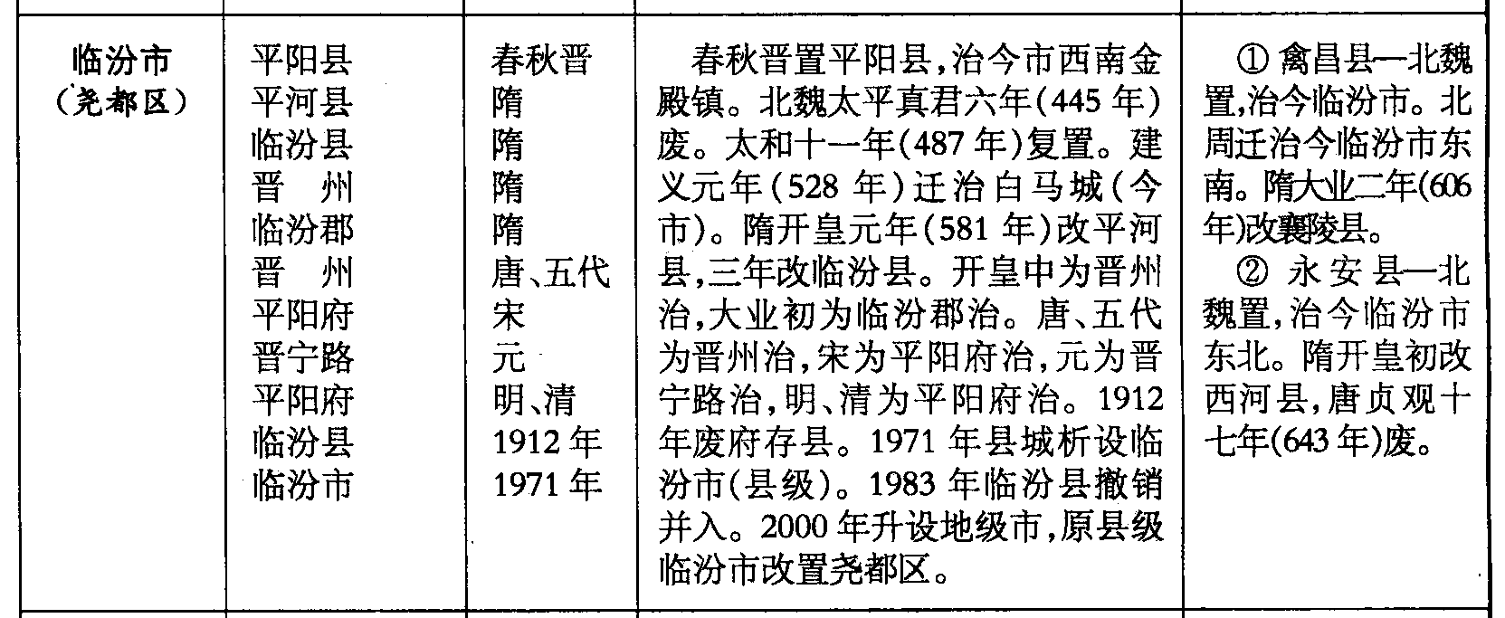 ❷ 永安县—北魏置,治今临汾市东北。隋开皇初改西河县,唐贞观十七年(643年)废。