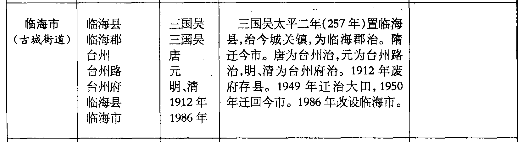临海市(古城街道)临海县临海郡台州台州路台州府临海县临海市三国吴三国吴唐元明、清1912年1986年三国吴太平二年(257年)置临海县,治今城关镇,为临海郡治。隋迁今市。唐为台州治,元为台州路治,明、清为台州府治。1912年废府存县。1949年迁治大田,1950年迁回今市。1986年改设临海市。