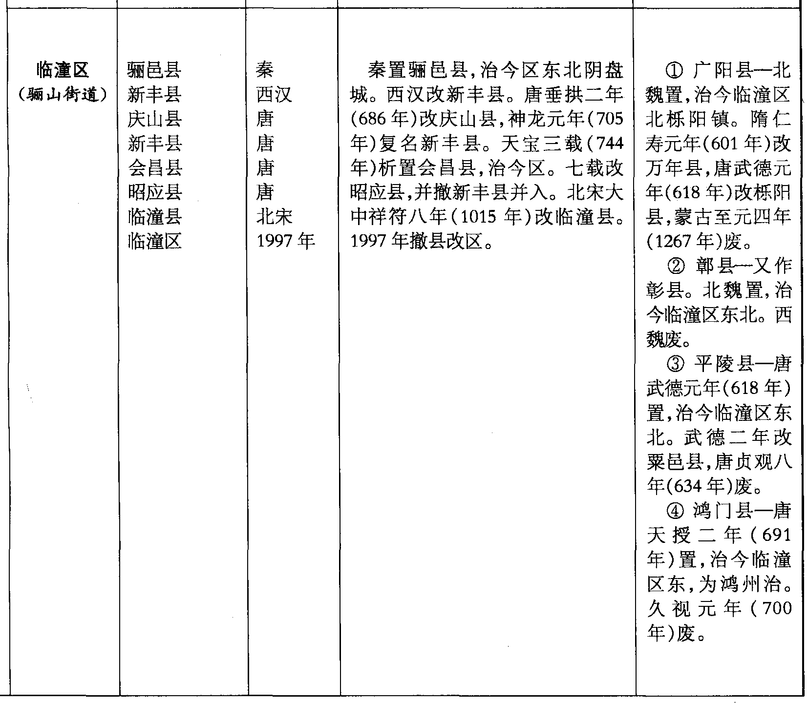 秦置骊邑县,治今区东北阴盘城。西汉改新丰县。唐垂拱二年(686年)改庆山县,神龙元年(705年)复名新丰县。天宝三载(744年)析置会昌县,治今区。七载改昭应县,并撤新丰县并入。北宋大中祥符八年(1015年)改临潼县。1997年撤县改区。