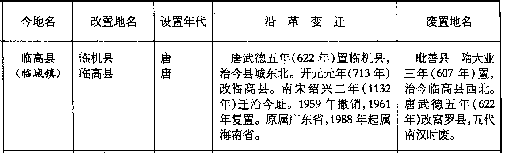 临高县(临城镇)临机县临高县唐唐唐武德五年(622年)置临机县,治今县城东北。开元元年(713年)改临高县。南宋绍兴二年(1132年)迁治今址。1959年撤销,1961年复置。原属广东省,1988年起属海南省。毗善县—隋大业三年(607年)置,治今临高县西北。唐武德五年(622年)改富罗县,五代南汉时废。