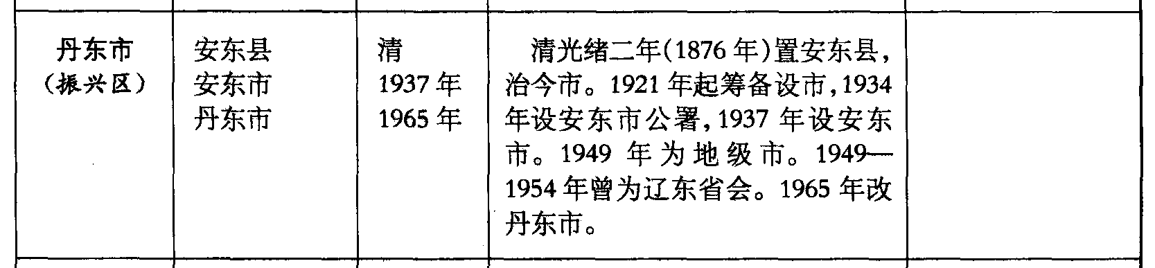 丹东市(振兴区)安东县安东市丹东市清1937年1965年清光绪二年(1876年)置安东县,治今市。1921年起筹备设市,1934年设安东市公署,1937年设安东市。1949年为地级市。1949—1954年曾为辽东省会。1965年改丹东市。