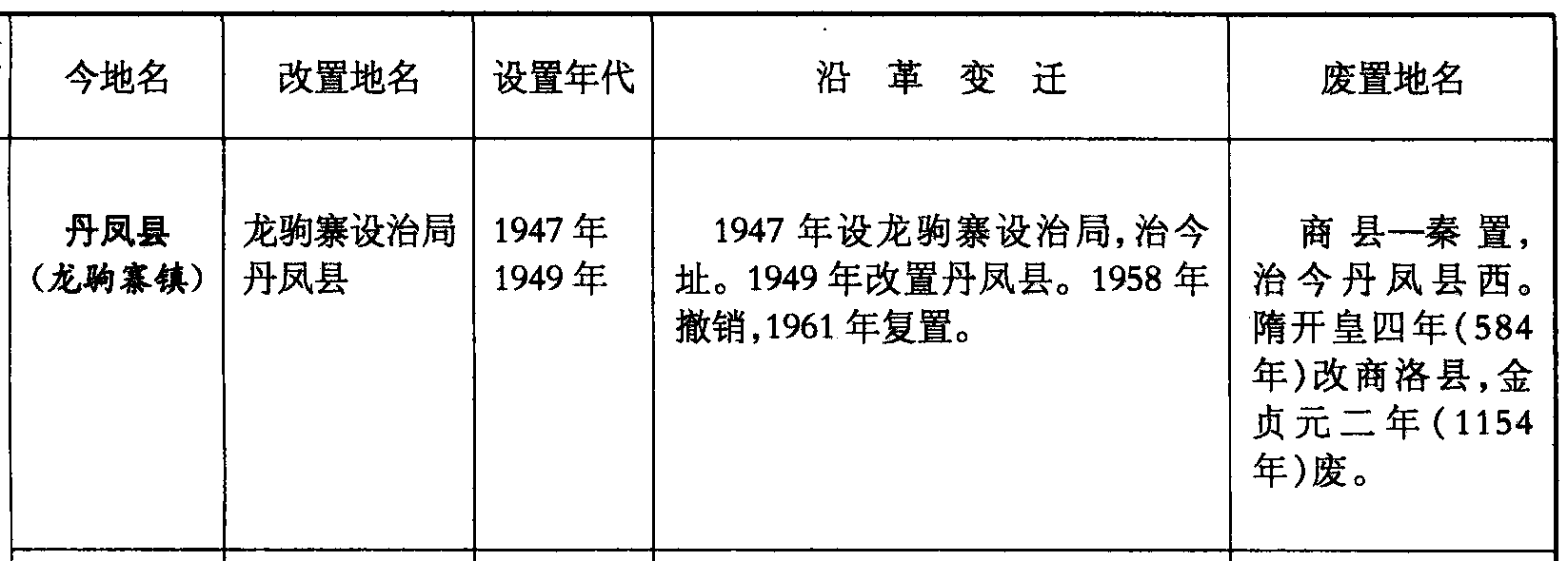 丹凤县(龙驹寨镇)龙驹寨设治局丹凤县1947年1949年1947年设龙驹寨设治局,治今址。1949年改置丹凤县。1958年撤销,1961年复置。商县—秦置,治今丹凤县西。隋开皇四年(584年)改商洛县,金贞元二年(1154年)废。