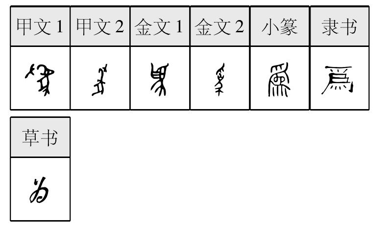 表意,甲骨文、金文象人以手牵象之形,表示役使大象劳作,小篆字形稍变,隶定为“爲”。本义读wéi,做,引申为充当、变成、是、治理、介词(引入动作行为的施事者)等;又读wèi,引申为介词,引入行为的受益者、对象、原因或目的等。变体作“為”。《简体字表》、《简化字表》把“爲”简作“为”,据草书楷化。