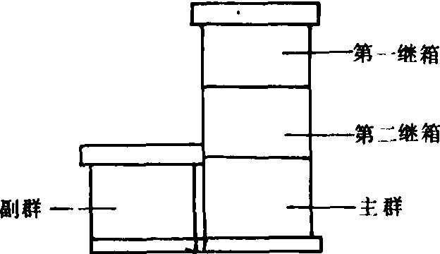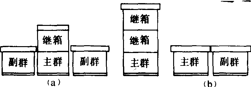主副群饲养management of principal andsubordinate bee colonies为加速蜂群繁殖、协调繁殖与采蜜的关系,而将强群和弱群搭配成组的技术措施。主副群饲养能收到以弱补强、以强助弱的效果,既可发挥强群采蜜的优势,又可发掘弱群繁殖的潜力;而在管理上则比双王群和多王群的管理简便。 主副群的组成,一般以群势为依据,将强群作为主群,即生产蜜、蜡、王浆的生产群;将弱群作为副群,即培育蜂子的繁殖群。在一个蜂场内,主群与副群的比例视蜂场实际条件和需要而定,一般为1:1或1:2;秋季由于副群经过 一段时间繁殖,补充主群的能力较强,主副群之比也可以是2:1。 主副群的管理依其目的可分为:❶以繁殖为主的主副群管理。将主副群并列在一起,最初从副群中提一框(不带蜂的)虫卵脾加入主群,同时在副群中加入空脾,当主群达到七八框蜂时,从主群提出带蜂或不带蜂的成熟蛹脾补助副群,经两三次补助,副群很快达到主群同样的群势。早春期间气温低,可将主副群同置一个箱体内,两群之间用薄闸板或铁纱隔板隔开。为了提早分蜂,也可将一个主群配上两个副群,主副群群势近于相等;当蜂群群势发展到一定阶段时,从副群提出带蜂的成熟蛹脾补入主群,同时在副群中加入空脾,待副群成蜂数量恢复到原数量时,再用同样方法作第2次补助;经过补助,主群迅速壮大,这时可促使主群筑造王台或进行人工育王,实现早育王、早分蜂。 ❷以采蜜为主的主副群管理。将两三个蜂群排列在一起,其主副群互相调整的方法与❶基本相同,使主副群的群势在流蜜前都繁殖到符合采蜜群的要求。如果在大流蜜期前主群仍达不到采蜜群要求,可以在流蜜刚到来时将副群移走,重新组成主副群;将主群保留在原地,加上继箱,以集中原主副群的飞翔蜂,实现强群采蜜(图1)。采用十六框卧式蜂箱的蜂场,其主副群的管理,是用闸板将箱体分为两区,10框区为主群,6框区为副群,各开巢门;当主群发展到满箱时给主群加第1继箱,其管理办法与一般继箱群的管理办法相似。当第1继箱充满蜜蜂,并面临主要蜜源流蜜时,在巢箱和继箱之间加第2继箱供蜂群贮蜜。(图2)