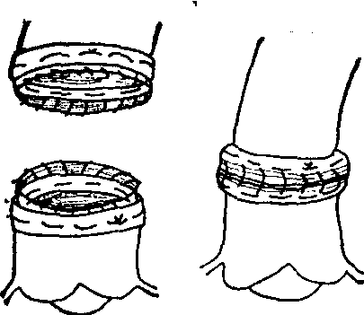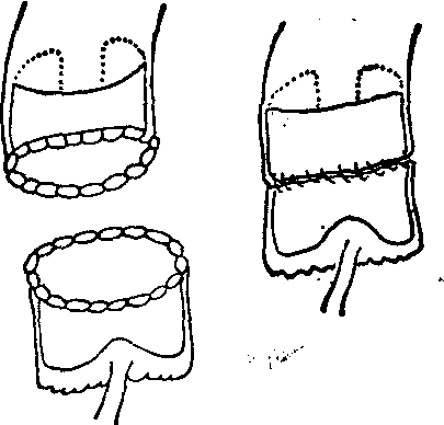 图4 主动脉壁内衬垫环状涤纶织片,连续缝合切端,再作对端吻合术