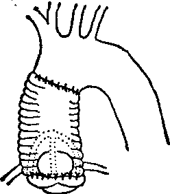图3 连续缝合主动脉壁,外用涤纶织片加固,再作对端吻合术