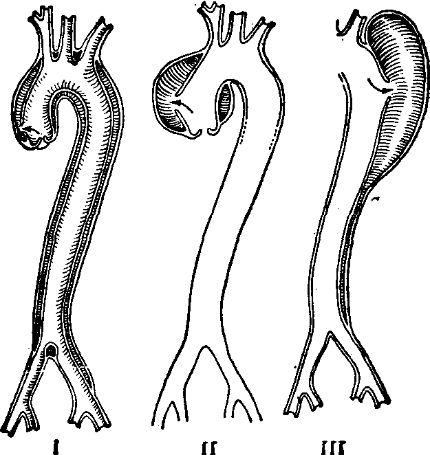 图1 主动脉夹层动脉瘤(DeBakey分型) Ⅰ型:主动脉壁剥离部位起始于升主动脉,并向主动脉远段延伸累及降主动脉和腹主动脉。 Ⅱ型: 主动脉壁剥离部位起始,并局限于升主动脉和主动脉弓部。 Ⅲ型:主动脉壁剥离部位起始于左锁骨下动脉开口的远侧,延伸范围局限于降主动脉。 近10年来Austen,Stinson等将主动脉夹层动脉瘤的分