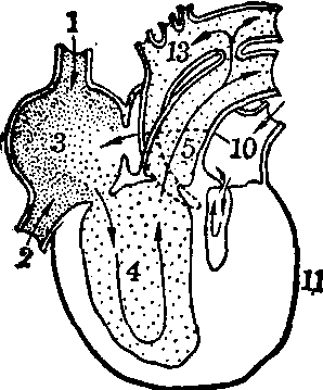 主动脉瓣闭锁时心脏大血管内血流情况示意。升主动脉萎缩,左心室小,左心房的动脉血经心房间隔的未闭卵圆孔进入右心房,与静脉血混合进入右心室和肺动脉。主动脉血液来自未闭的动脉导管与肺动脉沟通 (与第8页正常者图比较)。