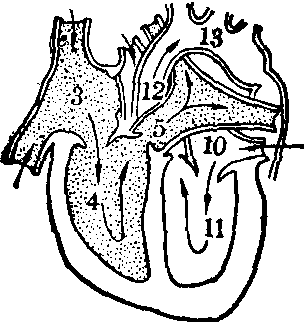 主动脉缩窄时心脏大血管内血流情况示意。缩窄位于主动脉弓与降主动脉交界处。主动脉内血液流经缩窄处受阻,缩窄段前、后主动脉段均扩张(与第8页正常者图比较)。
