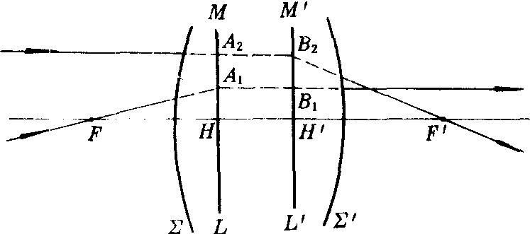 理想光学系统的一对基面。主平面是横向放大率β=+1的一对垂轴共轭面,又称主面。图中示出了作图求主平面位置的方法。Σ和Σ′分别表示系统最前和最后的折射面。作通过系统前焦点F的入射光线及其出射光线(该出射光线必与光轴平行),过这二光线的交点A1作垂直于光轴的平面ML,此平面叫做系统的前主平面,又称物方主平面或第一主平面。作平行于光轴的一条入射光线及其出射光线(该出射光线必通过系统的后焦点F′),过这二光线的交点B2作垂直于光轴的平面M′L′,此平面叫做系统的后主平面,又称像方主平面或第二主平面。通过前主平面上一点的入射光线,一定从后主平面距光轴等高处出射。例如A1和B1距光轴等高,A2和B2距光轴等高。二主平面与光轴的交点H和H′是一对主点,它们分别叫做前主点(又称物方主点或第一主点)和后主点(又称像方主点或第二主点)。单球面折射系统和球面反射镜的二主平面重合,二主点重合于球面顶点;薄透镜的二主平面亦重合,二主点重合于薄透镜的中心。