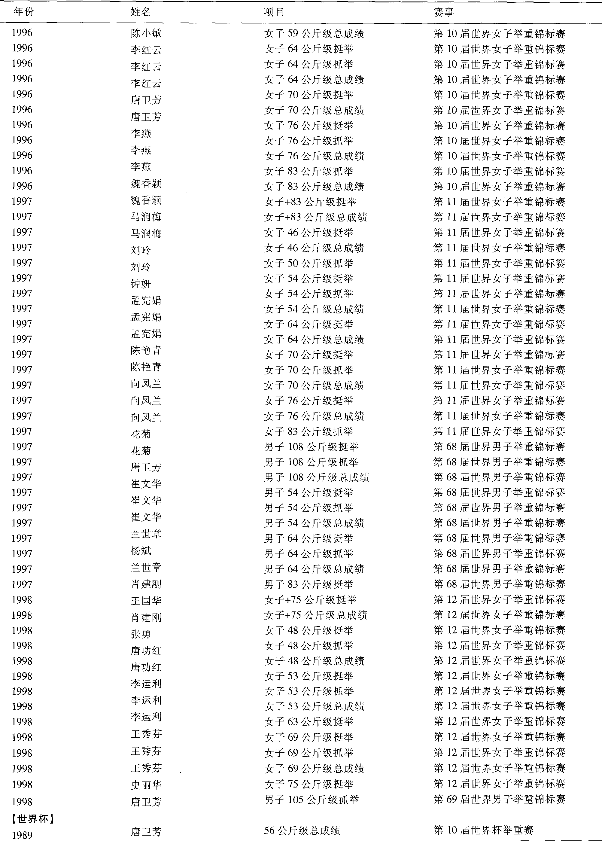 | 年份 | 姓名 | 项目 | 赛事 | 1993 1993 1993 1993 1993 1993 1993 1994 1994 1994 1994 1994 1994 1994 1994 1994 1994 1994 1994 1994 1995 1995 1995 1995 1995 1995 1995 1995 1995 1995 1995 1995 1995 1995 1995 1995 1995 1995 1995 1995 1995 1996 1996 1996 1996 1996 1996 1996 1996 1996 1996 1996 1996 | 李红云 李红云 李红云 李长萍 花菊 花菊 邢淑文 云艳红 云艳红 云艳红 黎峰英 邹飞娥 邹飞娥 邹飞娥 李红云 李红云 李红云 周红美 周红美 曲丽华 崔文华 张祥森 张祥森 唐灵生 占旭刚 关虹 关虹 关虹 刘秀华 刘秀华 刘秀华 陈小敏 陈小敏 陈小敏 唐卫芳 李红云 唐卫芳 李燕 张晓丽 李燕 万妮 万妮 万妮 关虹 关虹 关虹 刘秀华 刘秀华 刘秀华 张惜香 张惜香 张惜香 陈小敏 | 女子64公斤级挺举 女子64公斤级抓举 女子64公斤级总成绩 女子76公斤级挺举 女子76公斤级抓举 女子76公斤级总成绩 女子83公斤级抓举 女子46公斤级挺举 女子46公斤级抓举 女子46公斤级总成绩 女子54公斤级抓举 女子59公斤级挺举 女子59公斤级抓举 女子59公斤级总成绩 女子64公斤级挺举 女子64公斤级抓举 女子64公斤级总成绩 女子70公斤级挺举 女子70公斤级总成绩 女子76公斤级抓举 男子108公斤级抓举 男子54公斤级挺举 男子54公斤级总成绩 男子59公斤级挺举 男子70公斤级总成绩 女子46公斤级挺举 女子46公斤级抓举 女子46公斤级总成绩 女子50公斤级挺举 女子50公斤级抓举 女子50公斤级总成绩 女子59公斤级挺举 女子59公斤级抓举 女子59公斤级总成绩 女子70公斤级挺举 女子70公斤级抓举 女子70公斤级总成绩 女子76公斤级挺举 女子76公斤级抓举 女子76公斤级总成绩 女子83公斤级抓举 女子+83公斤级挺举 女子+83公斤级总成绩 女子46公斤级挺举 女了46公斤级抓举 女子46公斤级总成绩 女子50公斤级挺举 女子50公斤级抓举 女子50公斤级总成绩 女子54公斤级挺举 女子54公斤级抓举 女子54公斤级总成绩 女子59公斤级抓举 | 第7届世界女子举重锦标赛 第7届世界女子举重锦标赛 第7届世界女子举重锦标赛 第7届世界女子举重锦标赛 第7届世界女子举重锦标赛 第7届世界女子举重锦标赛 第7届世界女子举重锦标赛 第8届世界举重锦标赛 第8届世界举重锦标赛 第8届世界举重锦标赛 第8届世界举重锦标赛 第8届世界举重锦标赛 第8届世界举重锦标赛 第8届世界举重锦标赛 第8届世界举重锦标赛 第8届世界举重锦标赛 第8届世界举重锦标赛 第8届世界举重锦标赛 第8届世界举重锦标赛 第8届世界举重锦标赛 第67届世界男子举重锦标赛 第67届世界男子举重锦标赛 第67届世界男子举重锦标赛 第67届世界男子举重锦标赛 第67届世界男子举重锦标赛 第9届世界女子举重锦标赛 第9届世界女子举重锦标赛 第9届世界女子举重锦标赛 第9届世界女子举重锦标赛 第9届世界女子举重锦标赛 第9届世界女子举重锦标赛 第9届世界女子举重锦标赛 第9届世界女子举重锦标赛 第9届世界女子举重锦标赛 第9庙世界女子举重锦标赛 第9届世界女子举重锦标赛 第9届世界女子举重锦标赛 第9届世界女子举重锦标赛 第9届世界女子举重锦标赛 第9届世界女子举重锦标赛 第9届世界女子举重锦标赛 第10届世界女子举重锦标赛 第10届世界女子举重锦标赛 第10届世界女子举重锦标赛 第10届世界女子举重锦标赛 第10届世界女子举重锦标赛 第10届世界女子举重锦标赛 第10届世界女子举重锦标赛 第10届世界女子举重锦标赛 第10届世界女子举重锦标赛 第10届世界女子举重锦标赛 第10届世界女子举重锦标赛 第10届世界女子举重锦标赛 |