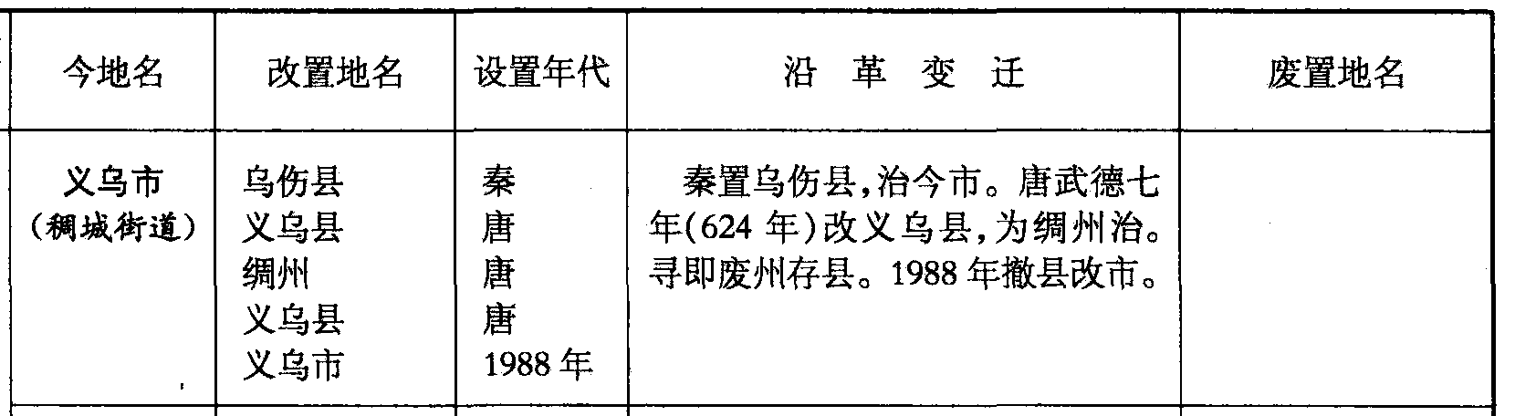 义乌市(稠城街道)乌伤县义乌县绸州义乌县义乌市秦唐唐唐1988年秦置乌伤县,治今市。唐武德七年(624年)改义乌县,为绸州治。寻即废州存县。1988年撤县改市。