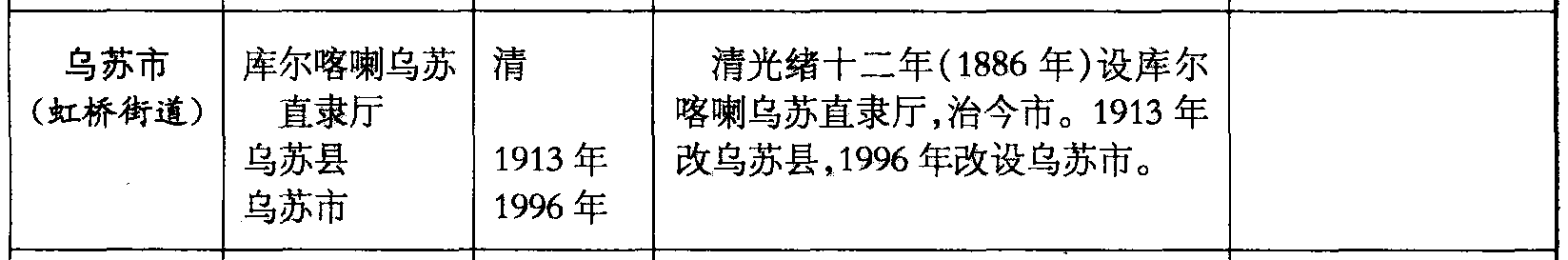 乌苏市(虹桥街道)库尔喀喇乌苏直隶厅乌苏县乌苏市清1913年1996年清光绪十二年(1886年)设库尔喀喇乌苏直隶厅,治今市。1913年改乌苏县,1996年改设乌苏市。