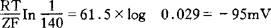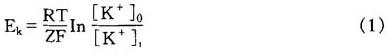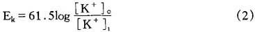 式中Ek即为k+的平衡电位,R是气体常数,T是绝对温度,Z是离子价,F是法拉第常数,[K+]。和[K+]1分别代表膜外和膜内的K+浓度。如果把各种常数值代入,在钾及钠离子时Z=1,自然对数基数为10,在标准温度37℃时,则公式(1)可简化为: