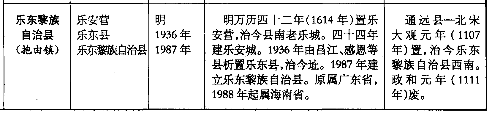 自治县(抱由镇)乐安营乐东县乐东黎族自治县明1936年1987年明万历四十二年(1614年)置乐安营,治今县南老乐城。四十四年建乐安城。1936年由昌江、感恩等县析置乐东县,治今址。1987年建立乐东黎族自治县。原属广东省,1988年起属海南省。通远县—北宋大观元年(1107年)置,治今乐东黎族自治县西南。政和元年(1111年)废。