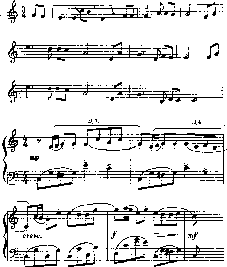 乐句可以用任何一和声的终止来结束,有时一个乐句就可构成一个乐段。(参见乐段条。) ☚ 乐汇 乐段 ☛ 乐句 乐句组成乐段的主要结构形式,是曲式结构中最基本的结构单位。组成乐句的小节数不定,四小节一句的乐句是较常见的。多数乐句有统一的调性,旋律进行内涵着明确的和声功能进行。乐句除自身是个完整的结构外,还可能由可划分的更小因素组成。 ☚ 3.乐句、乐节、乐汇 乐节 ☛ |