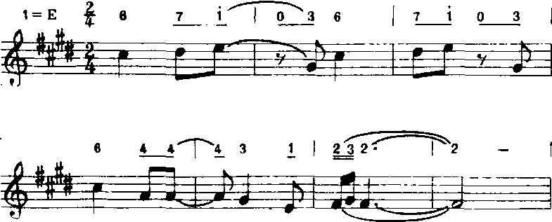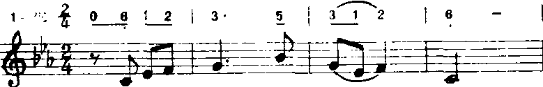 这个由7小节组成的不方整性乐句,落音为小调式的下属音,给人以半终止感。由以上几例显而易见,乐句已能鲜明地体现出作品的艺术形象。乐句的结构与歌词的句法是统一的。如同歌词一句完了时的停顿感一样,乐句应有明显的句逗感、半终止感或终止感。乐句的划分可通过其终止式或句尾的长音和休止等手段体现。