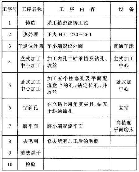 | 释义 | NHM型液压马达关键零件的工艺过程 (1)壳体的工艺过程 壳体的加工难度是: ·轴向尺寸公差。 ·五个柱塞孔与配流孔的角度控制。 ·五个配流孔之间的分度及与二定位销孔的分度角度控制。 ·二轴承座孔的精度。 宁波液压马达厂在加工NHM型液压马达壳体时,开始采用了在车床上镗孔或在铣床上镗孔、结合以柱塞孔定位钻配流孔的工艺,但加工精度不理想,轴向公差和分度要求很难保证。后来,从日本购进一台卧式加工中心和一台立式加工中心,在加工中心上采用一次定位将全部工序加工完毕的工艺方法,结合铸件采用精密浇铸工艺,不但彻底解决了上述工艺难题,而日工效也大大提高。其采用的工艺过程见表37.6-4 表37.6-4 壳体加工工艺过程表