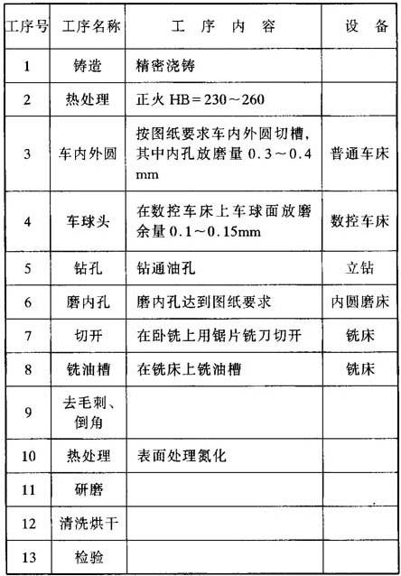 (2)连杆的加工工艺过程 连杆一端为内圆弧面,另一端为圆球面,是不规则的异形零件,加工装夹非常困难。为了便于加工,在铸造时应将五个或六个零件合铸成一体,待加工完毕后再切开,这样既可提高工效,又能保证加工精度。加工时应注意: ·为了减小切开后的内圆弧面变形和热处理时变形,尽量减少切削应力,因此,要尽可能采用精密浇铸方法,以减少毛坯的加工余量。 ·圆球面的加工,按传统的加工办法是采用铣床范成法加工或在车床上用靠模加工。前者为了保证公差尺寸。刀具的制作比较困难,后者虽然效率较高但精度很难达到设计要求。宁波液压马达厂在加工该零件时,采用在数控车床上加工圆球面,再在球面磨床上精磨,这样既提高了工效,又保证了加工精度。 其加工工艺过程见表37.6-5。 表37.6-5 连杆工艺过程表