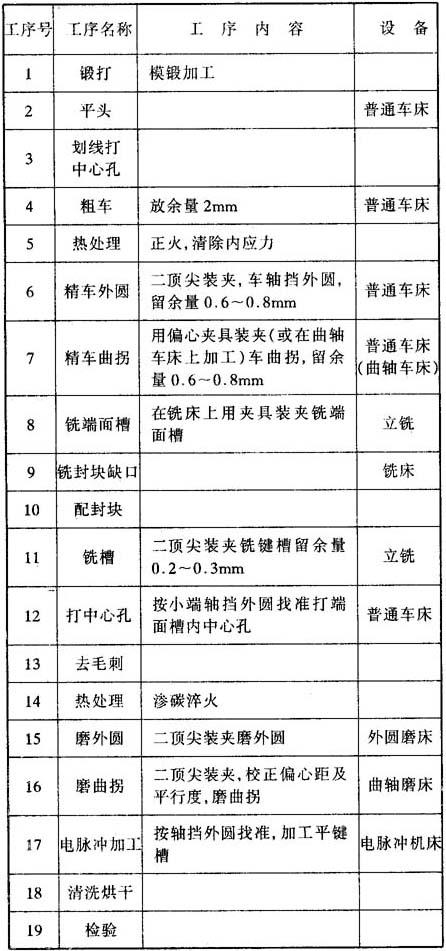 (3)曲轴加工工艺过程 曲轴加工与一般动轴相比具有几个不同的地方: ·一般的传动轴采用中碳钢或中碳合金钢调质处理,加工较容易。曲轴采用渗碳钢表面渗碳淬火,淬火后变形及硬度高给精加工带来一定困难。 ·曲拐处二边凸出部较薄,容易淬裂;曲拐偏心大,容易产生淬火变形。 ·加工精度要求高。 解决办法是: ·在粗车后进行热处理正火,一是清除切削应力,减少变形;二是为渗碳作准备。 ·适当增加磨削余量;增加渗碳深度,避免淬火变型形。 ·在渗碳时,在薄壁处涂保护层,以减少渗碳量,避免淬裂。 ·采用花键磨床及电脉冲加工,最终对花键及平键槽进行位置及尺寸修正。 其加工工艺过程见表37.6-6(以平键联接曲轴为例)。 表37.6-6 曲轴工艺过程表