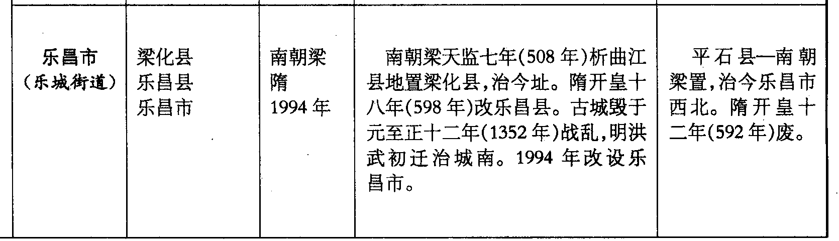 乐昌市(乐城街道)梁化县乐昌县乐昌市南朝梁隋1994年南朝梁天监七年(508年)析曲江县地置梁化县,治今址。隋开皇十八年(598年)改乐昌县。古城毁于元至正十二年(1352年)战乱,明洪武初迁治城南。1994年改设乐昌市。平石县—南朝梁置,治今乐昌市西北。隋开皇十二年(592年)废。