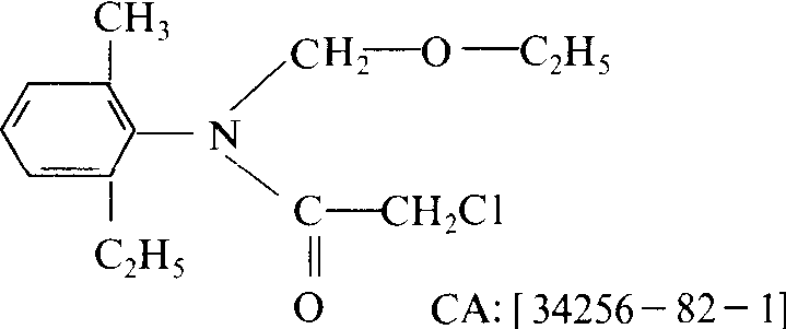 乙草胺acetochlor芽前选择性酰胺类除草剂。商品名禾耐斯、Harness、Mon097。化学结构式:  1971年由美国孟山都(Monsanto)公司首先开发成功。 性能 原药为淡黄色油状液体,不易挥发,水中溶解度为398毫克/升。熔点>0℃,沸点>200℃,密度为1.11(30℃),蒸气压>133.322帕,对高等动物低毒。原药大鼠急性口服LD50为2953毫克/千克。雌雄家兔急性经皮LD50为3667毫克/千克。对鱼的LC50:虹鳟鱼为0.45毫克/升,蓝鳃鱼为1.3毫克/升。对鹌鹑和鸭子的LC50均大于5620毫克/千克。对眼睛和皮肤有轻度刺激作用。 应用 乙草胺在大豆、花生、玉米及甘蔗地中防治一年生禾本科及一些双子叶杂草。对黄香附子、双色高粱、藜、大豆菟丝子、苋等杂草有较好的防效。在土壤中持效期为8~ 12星期。对下茬作物没有明显的影响。乙草胺用于大豆、玉米地除草,对作物安全。既可作苗前表土处理,亦可在播前浅混土2~ 4厘米处理。施药后7日内播种。用药量有效成分0.75~ 1.2千克/公顷。采用喷雾法施药,每公顷对水450~600升。苗前表土处理是在播后和杂草出苗之前施药,方法和剂量同播前混土处理。当田间杂草(如蓼等)多时,可与嗪草酮混用,提高防治效果。乙草胺acetochlor酰胺类内吸选择性、芽前除草剂。化学名称:2′-乙基-6′-甲基-N-(乙氧甲基)-2-氯代乙酰替苯胺。化学结构式如下。原药为淡黄色液体,熔点>0℃,蒸气压>133.322 Pa,沸点>200℃,微溶于水,可溶于多种有机溶剂,性质稳定,不易光解。能被杂草的幼芽和幼根吸收,抑制杂草蛋白质合成,使杂草停止生长并死亡。适用于大豆、玉米、花生、油菜及棉花等作物使用。防除稗草、马唐、看麦娘、狗尾草、藜、苋、蓼、鸭跖草等一年生单、双子叶杂草,对菟丝子也有效。对人、畜低毒,大鼠急性口服LD50为2 593 mg/kg,家兔急性经皮LD50为3 667 mg/kg。对皮肤和眼有轻微刺激作用。