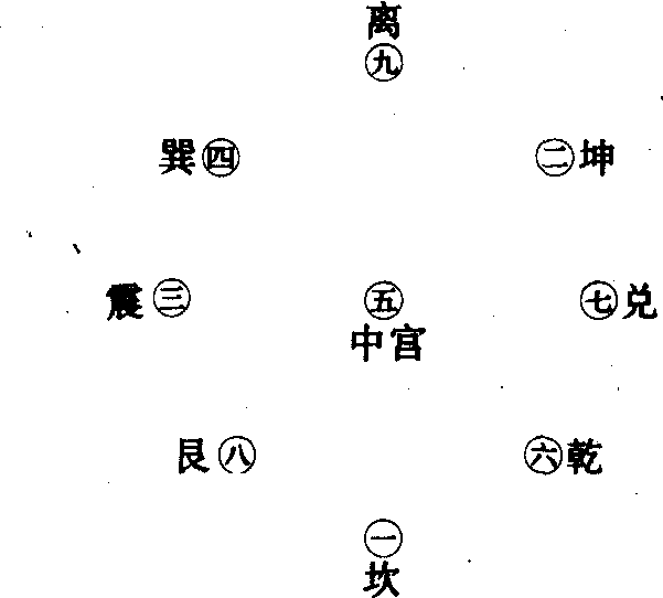 八卦掌步法。八卦的八个方位加上中央合称九宫,在分置于九宫位置的标志物之间,穿行绕走称为“九宫步”,也称“飞九宫”、“走九宫”。初习九宫步时,其行进顺序採用世传“太一行九宫之法”。即“始坎、次坤、次震、次巽、复息于中宫,自中宫至乾、次兑、次艮、次离,一周毕矣。”此顺序称为“顺穿”。“逆穿”则是由离宫返回坎宫。这个顺序还被描述为“二四为肩,六八为足,左三右七,戴九履一,五居中央”(见图)。即:顺穿时先从第一宫始,依次环每宫绕走一圈,至第九宫;逆穿时从第九宫起,依次绕行返归第一宫。此法娴熟后,可不依九宫顺序,随意绕宫穿行,随意练习拳脚散招。把置于九宫的标志物假设为敌手,遇之或闪让,或击撞。宫与宫之间的距离可随训练程度的提高逐步缩小。开始时株行距可宽至五尺,渐次减少为二尺或仅容侧身而过。有以六尺五寸之木桩分立各宫为标志物者,称为“九星躲闪桩”,其穿行顺序同于九宫步。唯其穿行时,仅重下盘之躲闪。