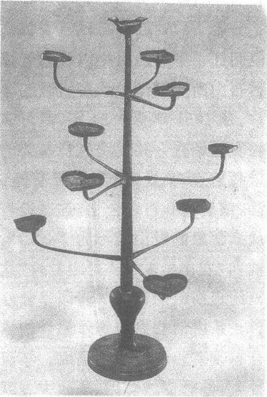 | 释义 | 九枝盏铜灯 九枝盏铜灯西汉。通高85厘米。1976年广西壮族自治区贵县罗泊湾1号墓出土。广西壮族自治区博物馆藏。此灯圆形底座,座上铸一灯柱,作为灯的主干,从主干向外分出三组枝杈,每组三枝,每杈承桃形灯盏一台,盏内各有一插扦。柱顶端立一鸟。灯盘底座上有弦纹三周。灯用榫铆套扣成一体,可拆卸,十分方便。
