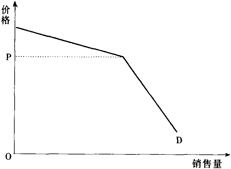在理论上,习惯定价犹如在曲折需求曲线的突点处定价。图中P为突点处价格(即习惯价格)。在P之上定价,因需求弹性大而销售量迅速下降;在P之下定价,因需求弹性小而销售量增加很少。因此价格在较长时间内稳定在习惯性价格水平上。