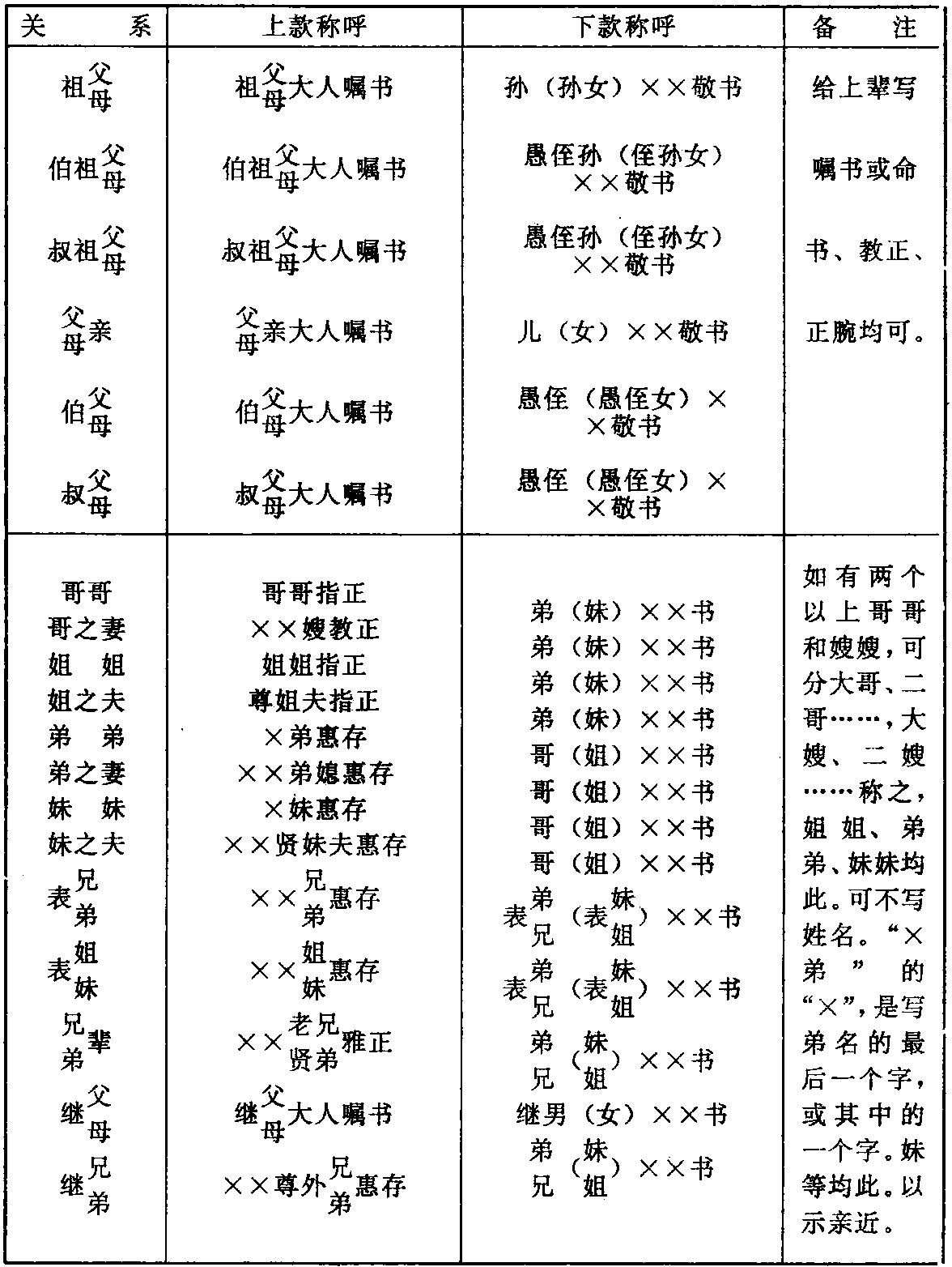 续表 | 关 系 | 上款称呼 | 下款称呼 | 备 注 | | 同学 | ××学兄指正 | 弟××书 | 也可写学 长、同学 | 同学友之祖 同学友之父 | ××世伯翁正腕 ××尊世伯正腕 | 世眷晚生××书 世侄××书上 | | | 同学友之兄弟 | ××几会兄指正 | 世眷小弟××书 | | 同学友之子 同学友之侄 | ××贤世兄指正 ××贤世兄指正 | 世眷教弟××书 世眷侍教弟××书 | | | 己夫之祖父母 | 曾祖父母大人嘱书 | 愚孙妇女××书 | (以下为女书 家用) | | 己夫之祖姐妹 | 曾祖母姑大人嘱书 | 愚侄孙妇女××书 | | | 己夫之母 | 母亲大人嘱书 | 愚媳妇××书 | | | 己夫之父兄弟妻 | 尊伯叔姆婶大人嘱书 | 愚侄妇女××书 | | | 己夫之父姐妹 | ××尊母姑指正 | 愚侄妇女××书 | | | 己夫之兄弟妻 | ××尊贤几姆婶指正 | 娣妹妇或愚姐妹××书 | | | 己夫之姐妹 | ××尊贤几姑指正 | 弟愚妇嫂××书 | | | 己之兄妻 | ××尊兄嫂指正 | 女弟××书 | | | 己之弟妻 | ××贤弟妇指正 | 愚嫂××书 | | 己之姐妹 儿子之妻 女 儿 儿 子 | ××尊贤姐妹指正 ××儿媳妇惠存 付××女儿藏 付××儿子藏 | 愚妹姐××书 母亲或舅姑××书 母(父)书 母(父)书 | | | 己夫之侄妻 | ××贤侄妇惠存 | 伯叔姆婶××书 | |