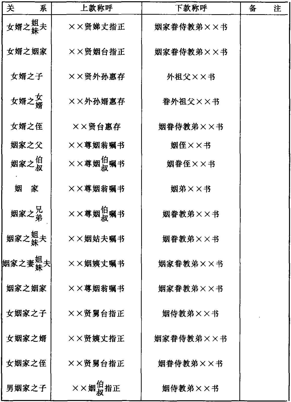 续表 | 关 系 | 上款称呼 | 下款称呼 | 备 注 | | 姑夫之子 | ××贤表兄弟惠存 | 表弟兄××书 | | | 姑夫之婿 | ××表姐妹夫指正 | 表内兄弟××书 | | | 姑夫之侄 | ××贤表兄弟惠存 | 姻眷教弟××书 | | | 姑夫之子姻家 | ××尊姻台指正 | 姻家眷教弟××书 | | | 姨夫之父 | ××尊公爹嘱书 | 姻家晚生××书 | | | 姨夫之伯叔 | ××姻伯叔祖嘱书 | 姻家眷晚生××书 | | | 姨夫之兄弟 | ××表伯叔祖嘱书 | 姻家眷侄××书 | | | 姨夫之姐妹夫 | ××尊姑丈嘱书 | 姻家眷侄××书 | | | 姨夫之姻家 | ××尊姻家嘱书 | 姻家眷侄××书 | | | 姨夫之子 | ××贤表兄弟惠存 | 表弟兄××书 | | | 姐妹夫之祖父母 | ××尊姻祖嘱书 | 姻晚生××书 | | | 姐妹夫之父母 | ××尊姻翁母嘱书 | 姻侄××书 | | | 姐妹夫之伯叔 | ××尊姻伯叔嘱书 | 姻眷侄××书 | | | 姐妹夫之兄弟 | ××姻伯叔台嘱书 | 姻眷教弟××书 | | | 姐妹夫之姐妹 | ××尊姻姑嘱书 | 姻家眷弟××书 | |