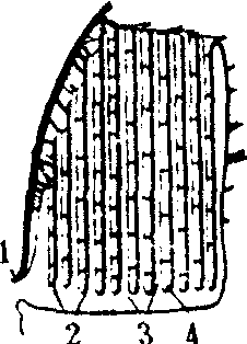 书肺横切 1.书肺页 2. 角质柱 3. 前庭 4. 书肺孔 书肺 书肺shufei节肢动物门蛛形纲动物所特有的一种呼吸器官,又称“肺囊”。在腹部前方的两侧,有1对或多对囊状气室,各室内有15~20个薄片(肺叶),片与片之间相互分离,都是由体壁折皱重叠而成,呈书页状,故称书肺。当血液流经书肺时,同气门引入的空气相接触,进行气体交换。书肺数目不尽一致,蜘蛛为1~2对(二肺蜘蛛或四肺蜘蛛);蝎有4对。书肺和书鳃(见“书鳃”条)是同源的,是书鳃适应空气呼吸内陷而成的结构。