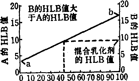 变浊温度 环氧乙烷衍生的非离子型乳化剂水溶液,升温过程中由清变浊时的温度,也称浊点(cloudpoint)。这种溶液分子中的醚键氧原子与水分子中的氢原子易形成氢键。当水温升高时,所结合的水分子易脱落,乳化剂的水溶性随之下降,形成两个液相,体系变混浊,这种现象发生时的温度即变浊温度。当温度下降时,体系又变为均相,此时的温度称为澄清温度。在实际测定中,澄清温度常作为“浊点”测定。浊点随着产品中结合的环氧乙烷分子数的增加而增高。非离子型乳化剂的浊点非常重要,因为临近温度时界面活性的性质变化很快。非离子型乳化剂的浊点测定,是估价结合在给定基团上的环氧乙烷量的快速方法。 水数 1克乳化剂或被乳化物的样品,在20毫升的二氧六环与乙二醇醚的混合液(6+4)中,用蒸馏水滴定至溶液呈现混浊为止,所耗用的蒸馏水毫升数即为水数。水数标志着乳化剂或被乳化物的亲水性情况,可作为配制乳油的参考。 乳化剂单体的质量标准中,大多规定浊点、pH值或水数范围。有些并规定折光率范围。斯盘、吐温系列乳化剂单体还规定羟值、酸值及皂化值。混合乳化剂的质量标准中,大多规定外观、pH值和水分含量。有些须标明HLB值。乳化剂emulsifier农药助剂之一。能使两种原来互不相溶的液体(如油和水),其中一种液体以极小的液珠稳定分散(分散相)在另一种液体中,形成不透明或半透明的乳浊液。其主要作用是降低分散相的表面张力,阻止另一种小液珠的凝聚。农药加工中使用的乳化剂均为水包油型乳化剂,即使细小的油粒分散在水中的乳化剂。 乳化剂 乳化剂乳化剂系指一类能降低表面张力并能起乳化作用的表面活性剂,另外一类是具有乳化能力的天然胶类或其他物质。它们都能在被分散的液滴外形成一层机械强度较高的吸附膜,使分散相经机械作功而分散成细滴所需的能量减少,液滴受膜保护而不合并,在乳剂形成及保持稳定方面起极重要的作用。乳化剂的分子上有极性与非极性基团,在乳剂分散相液滴外面的膜上定向排列,极性基团面向水相而非极性基团面向油相。乳化剂分子的极性与非极性的相对强度应成一定比例。极性与非极性的相对强度可以用亲水亲油平衡值(HLB值)来表示,即以极性的聚氧乙烯的HLB值作为20,非极性的烷类化合物的HLB值作为0,一般乳化剂除个别外均在此范围内,其中O/W型乳化剂的合适HLB值为8~18,W/O型乳化剂的合适HLB值为3~6。表面活性剂的HLB值有加和性,混合乳化剂的HLB值可用下列计算: 其中HLBA、WA、HLBB、WB分别为乳化剂A及B的HLB值与重量。混合乳化剂的HLB值也可从下图用图解求得:可将A的HLB值与B的HLB值在图上相应点连成直线,从B的%数作垂直线与a b线相交,再自交点作水平线交于B纵坐标即得到此组分的混合乳化剂的HLB值。被乳化物质也有一个对乳化最有利的所需HLB值。如果被乳化物质不止一种,所需HLB值也具有加和性,混合被乳化物质的所需HLB值计 算方法同上。常见的油脂性物质二种类型乳剂所需HLB值如下表: 在混合乳化剂中B的百分比 | 油相 | W/O乳剂 | O/W乳剂 | | 亚油酸 | - | 16 | | 油酸 | - | 17 | | 硬脂酸 | - | 17 | | 鲸蜡醇(十六醇) | - | 15 | | 蓖麻油 | - | 14 | 棉子油 松节油 一般植物油 | 5 - - | 10 16 7~12 | 液状石蜡 凡士林 煤油 | 4 5 - | 10~12 12 12.5 | 石蜡 蜂蜡 无水羊毛脂 | 4 4 8 | 10~12 12 12 |