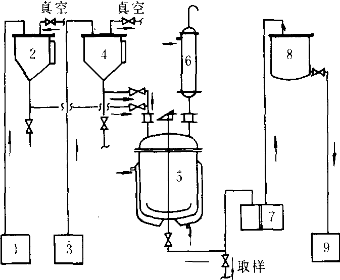 乳油调制工艺图 (据华世豪等) 1.农药原油;2.原油计量槽;3.溶剂;4.溶剂计量槽;5.调制釜;6.冷凝器;7.过滤器;8.乳油贮槽;9.成品包装 动或半自动式包装。中国目前大都采用0.5~1千克玻璃瓶包装,优点是成本低。缺点是容易破碎、不安全。用金属容器或特制塑料容器包装安全可靠,但成本较高。 |